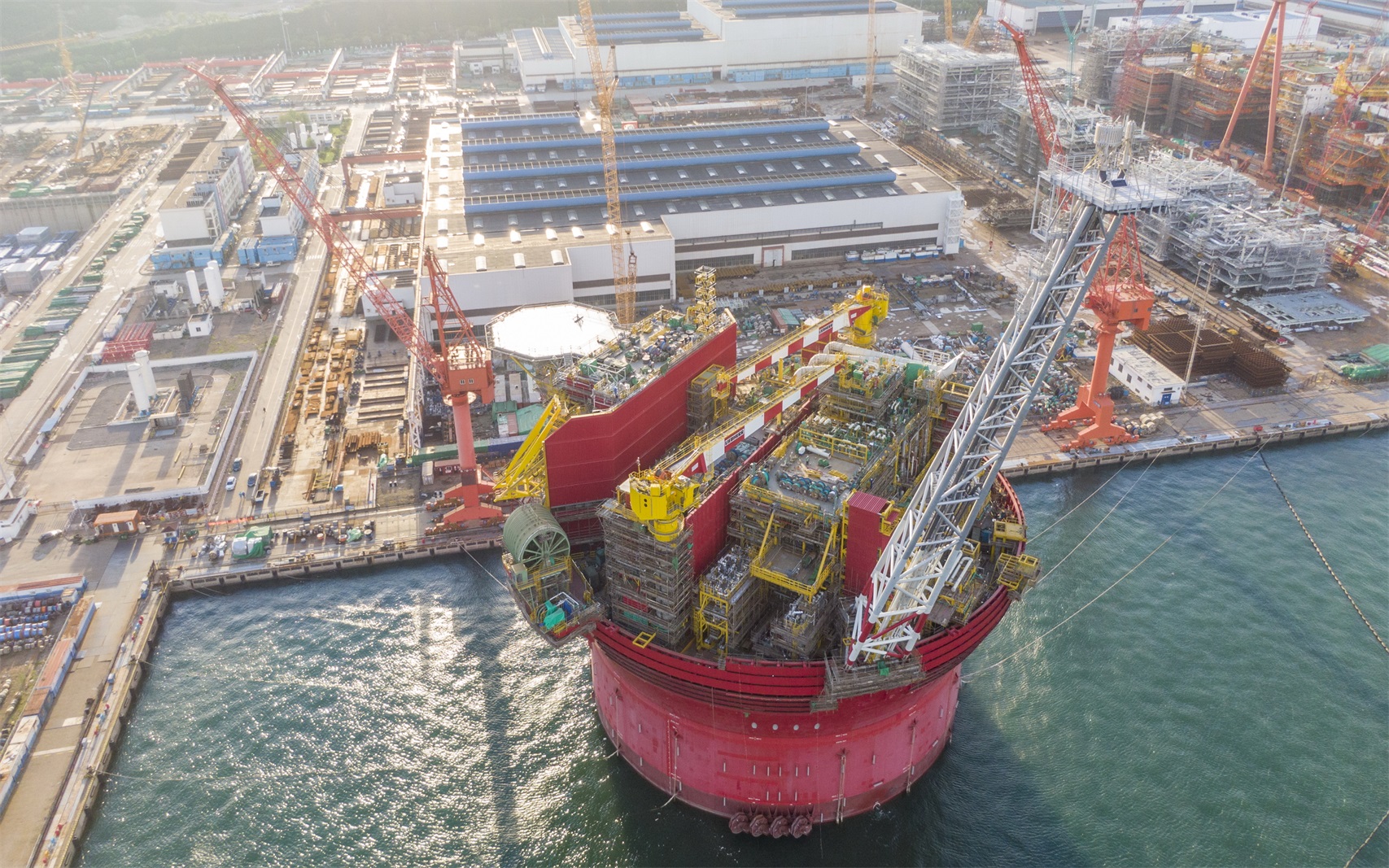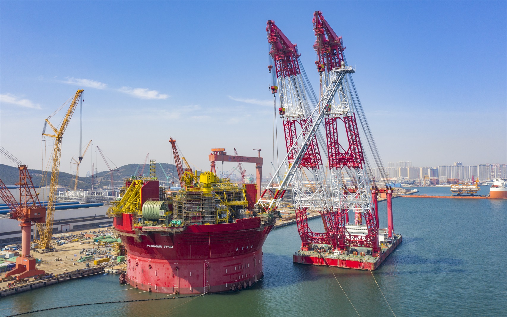 項目名稱:殼牌企鵝項目 預計完工時間:2022年9月 項目簡介:企鵝項目是海油工程承攬的首個圓筒形FPSO整船建造項目,位于英國北海,距離海岸線160km,水深165米,采用3*4多點系泊系統。采用SEVAN 400圓筒型概念設計,設計壽命20年,總重約3.1萬噸,其中船體總重約1.7萬噸,上部模塊總重約1.4萬噸。 項目亮點:該項目高度集成、作業空間有限、安全等級要求高、建造難度大、工藝復雜、技術難點多、殼牌檢驗標準高,需滿足“20年不回塢”超高建造標準。在新冠肺炎疫情嚴重影響下僅用27天的有效時間內完成了18吊這一世界級的模塊集成吊裝工作,獲得了客戶殼牌的高度認可。
